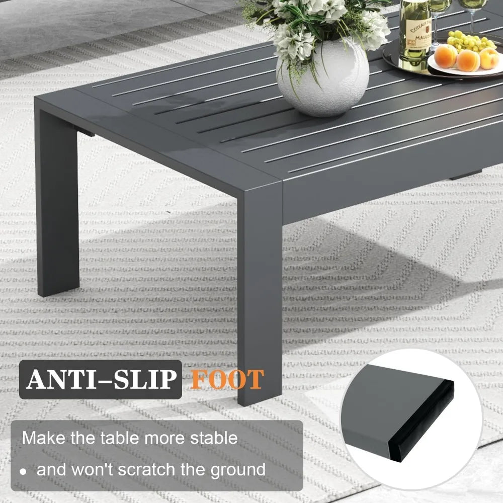 Crafted from high-quality aluminum, this patio furniture set is lightweight yet sturdy, ensuring longevity without the hassle of rust. The modern design boasts clean lines and a sleek, minimalist aesthetic, making it perfect for any outdoor setting. The rectangular shape maximizes seating capacity, allowing for more guests to join your outdoor gatherings.