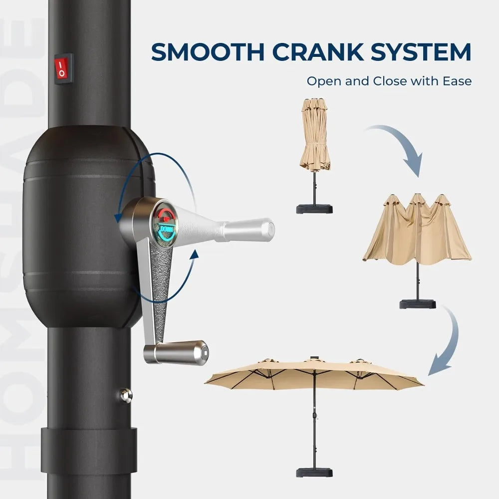 Enhance your outdoor space with the Double Sided Patio Umbrella with Solar Lights, designed to provide ultimate shade and illumination for your enjoyment. Measuring an impressive 15ft, this double-sided patio umbrella offers a significantly larger shade area than conventional umbrellas, making it perfect for multiple lounge chairs and large rectangular tables. Say goodbye to the scorching sun and hello to relaxation!