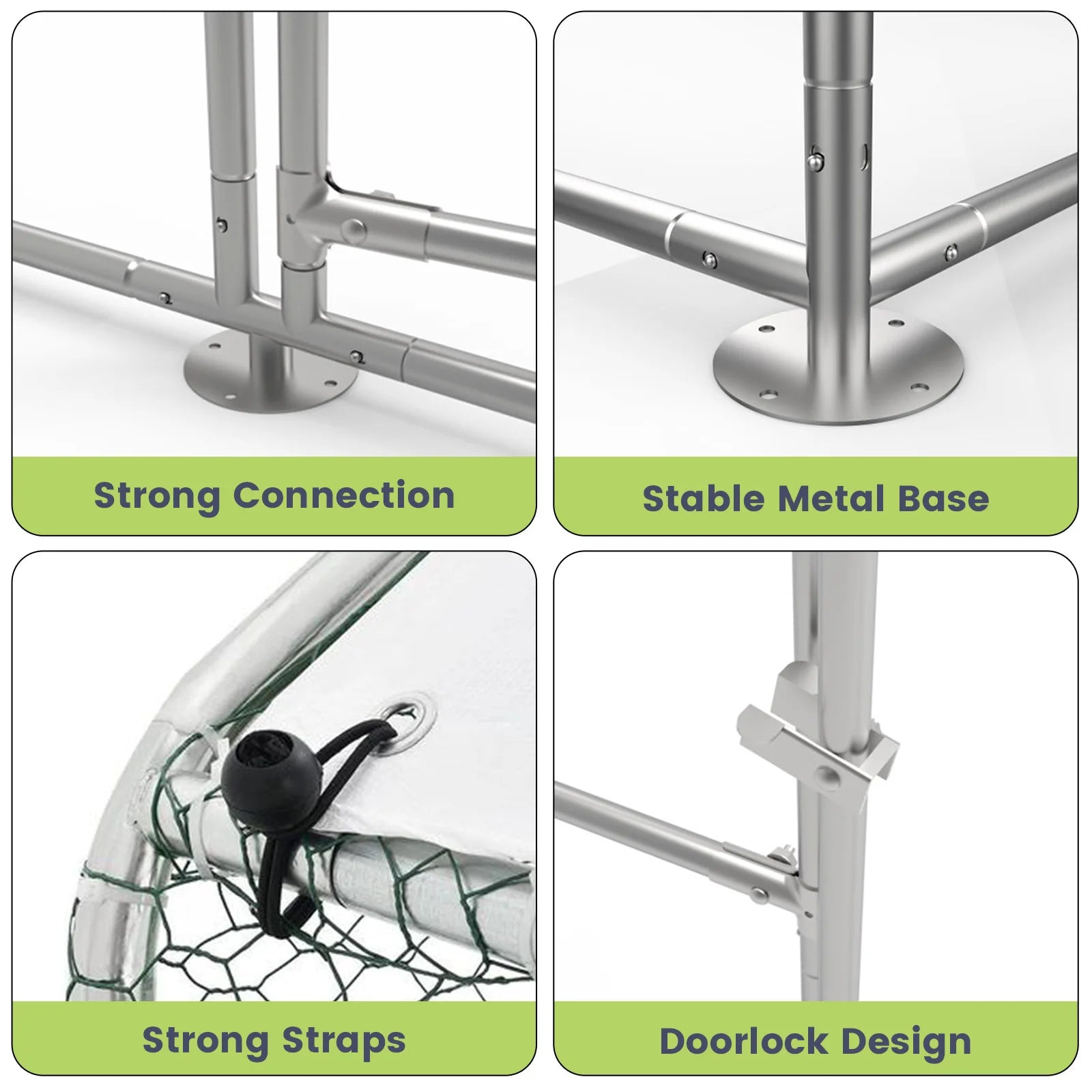 Transform your backyard into a safe haven for your feathered friends with our Walk-in Metal Poultry Cage with Waterproof Cover for Chickens. This premium poultry cage is expertly designed to offer a secure environment for your chickens while ensuring their comfort and safety. Constructed from sturdy iron, this chicken coop is built to last, featuring a heavy-duty steel frame and full-coverage PVC-coated steel wire mesh that provides optimal protection against predators and harsh weather conditions.
