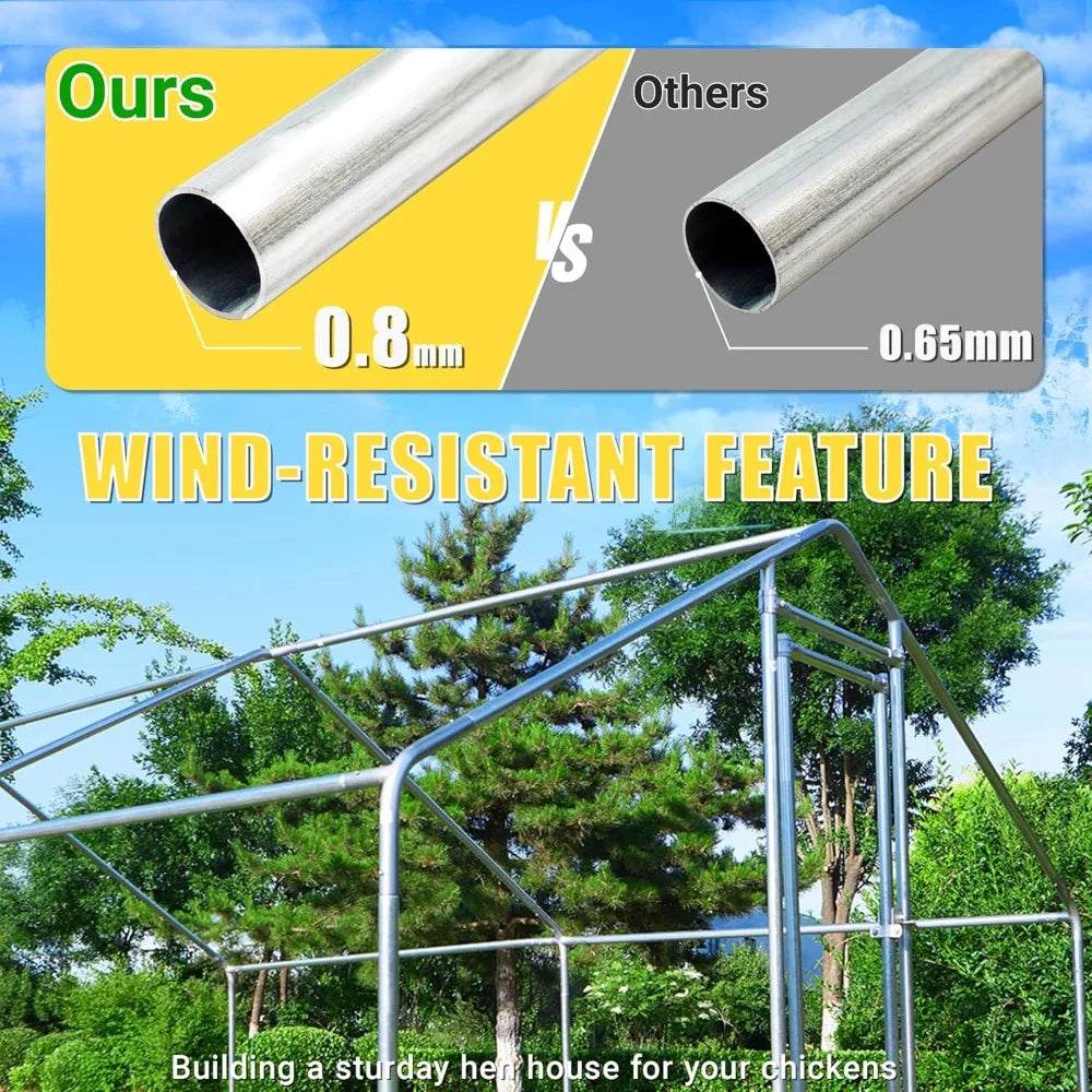 Introducing the Durable Metal Chicken Coop with Run – the ultimate sanctuary for your chickens! Crafted with a sturdy steel frame, this coop is designed to provide maximum durability and security for your feathered friends. Measuring 153.6"L x 118"W x 79.2"H, it offers ample space for your chickens to roam freely while ensuring they are protected from the elements.
